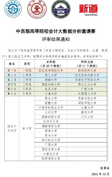 10月31日,由西南财经大学、西安交通大学和武汉大学联合发起,新道科技股份有限公司提供技术支持的中西部高等院校会计大数据分析邀请赛顺利落幕。来自四川大学、武汉大学、西安交通大学、兰州大学、重庆大学等中西部28所985、211高校的31支队伍在线上同场竞技。由黄毅祥老师、徐文娟老师带队,李秀秀、吴梓敏、付紫玉三人组成的本科生队荣获本科组“一等奖”;由雷玲老师、孔荣老师指导的,黄昱、颜晓彬、周静三人组成的研究生队荣获研究生组“二等奖”。