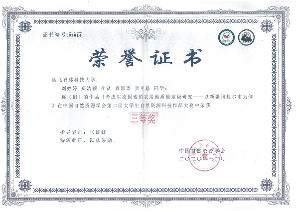 本次大学生自然资源科技作品大赛是由中国自然资源学会主办,中国自然资源学会教育工作委员会、江苏师范大学地理测绘与城乡规划学院、南京大学地理与海洋科学学院、江苏省地理学会和广东国地规划科技股份有限公司承办,旨在加强大学生对我国自然资源的科学认识,鼓励大学生树立人与自然和谐共生的绿色发展理念,调动大学生参与自然资源科技事业的积极性与创造性,提高资源相关专业大学生对资源问题的分析与实践能力,促进不同院校、不同专业方向大学生之间的交流学习,助力资源科技人才的成长与提高。本次比赛中,澳门pg官网经管学院2018级本科生刘婷婷、郑洁颖、袁思瑶、李贤、吴申魁在张蚌蚌老师精心指导下,以“考虑生态因素的农用地质量定级研究——以新疆阿拉尔市为例”为主题参赛,取得了三等奖的成绩,展现了澳门pg官网土地资源管理专业的教学水平以及各位同学的专业素养。