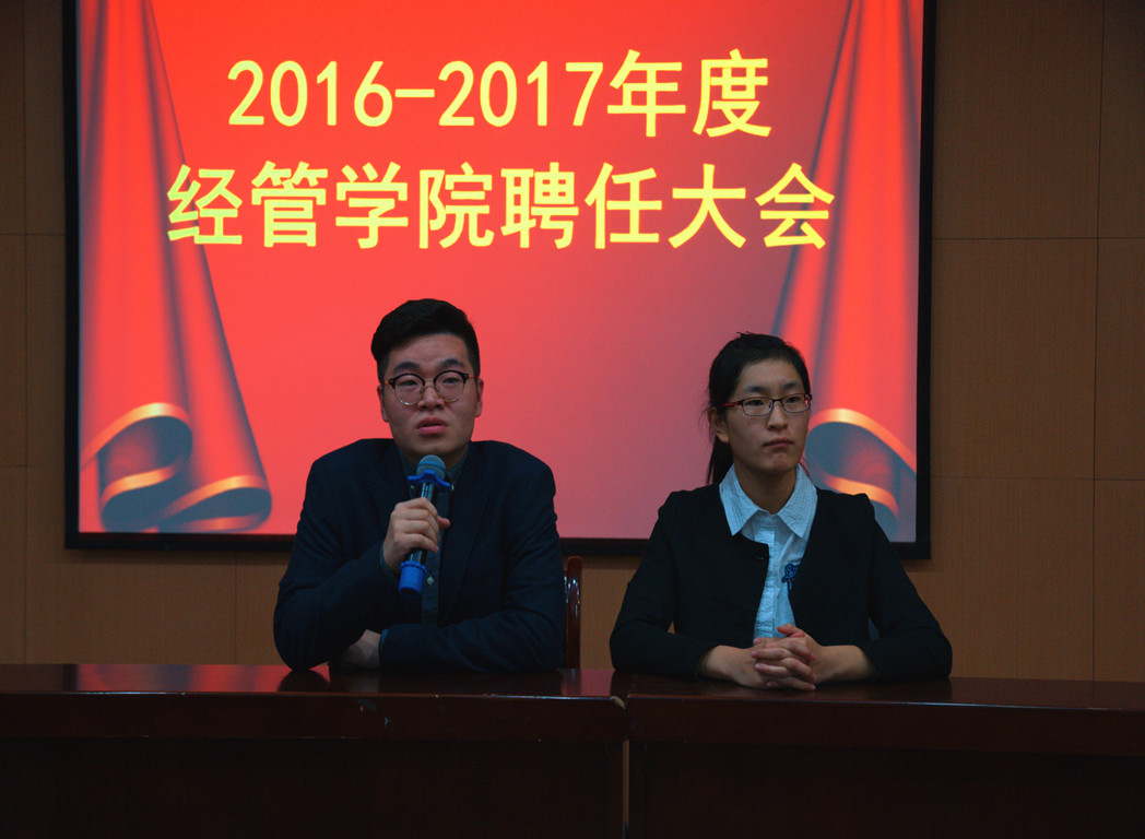 为做好学生干部的传帮带工作,帮助新一批学生干部更好地开展团工委学生会的工作,近日,经管学院于北绣南报告厅举办2016-2017学年学生干部聘任大会。团工委书记梁子龙及各年级辅导员出席此次大会,全体团学干部、学院各队队长及2016级新生助理班主任参加。