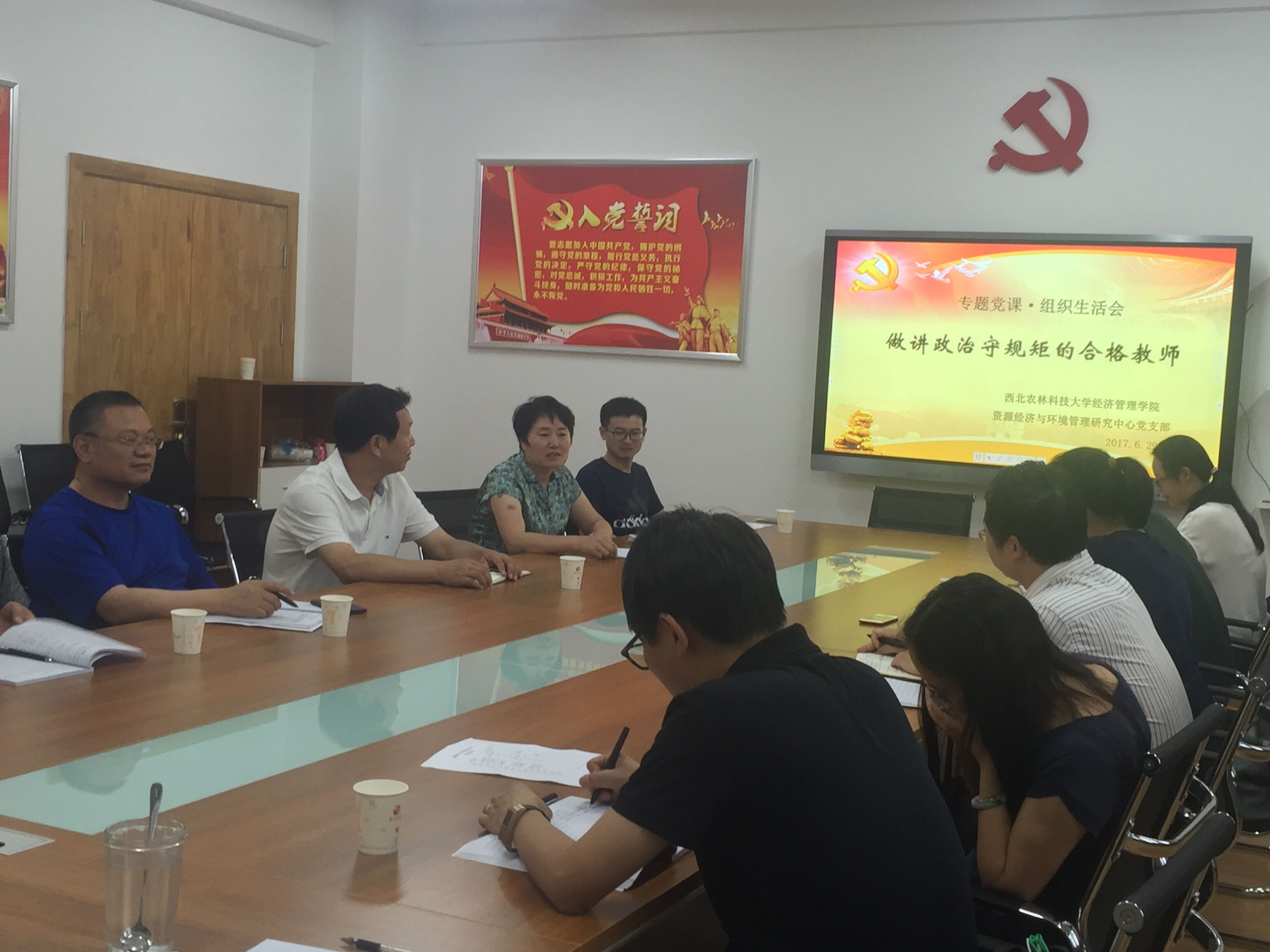 6月29日下午,经管学院资源经济与环境管理研究中心党支部全体成员在经管园林大楼C205会议室召开“做讲政治、守规矩的合格教师”党组织生活会。院党委书记姚晓霞担任主讲嘉宾,校党委副书记徐养福、中心两位民盟人士李桦教授和王博文副教授出席,会议由支部书记骆耀峰同志主持。