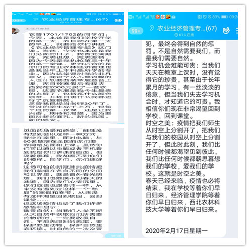 王征兵教授以致2017级农管专业学生一封信,开启网络课程第一课,读来亲切又感动。他寄语学生敬畏自然:保护野生动物,保护自然生态环境;告诉学生学习机会难能可贵:当大家失去学习机会时,才知道它的可贵;感受时空之美:疫情虽把我们师生暂时分开,但大家依然朝思暮想我们的学校,热爱我们的学校。随后他和团队老师采用网上国家报告厅专题视频和QQ群网络平台,师生线上答疑交流,为2个班学生传授《农业经济管理专题》第一章“新型农业经营主题培育”知识点。