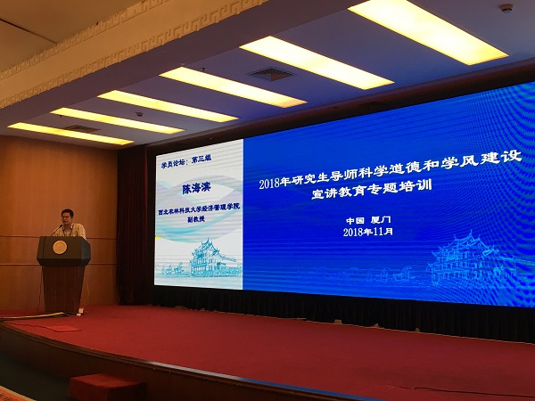 11月6日—9日,由全国科学道德和学风建设宣讲教育领导小组主办,福建省科协、福建省教育厅、厦门大学承办的“第一期研究生导师科学道德和学风建设宣讲教育专题培训”在福建省厦门市举行。来自教育部直属高校、中科院各科研院所及中科院大学、社科院各科研院所及社科院大学130余名近两年新晋研究生导师参加。澳门pg官网2017年新晋硕士生导师陈海滨副教授代表学校参加了专题培训。
