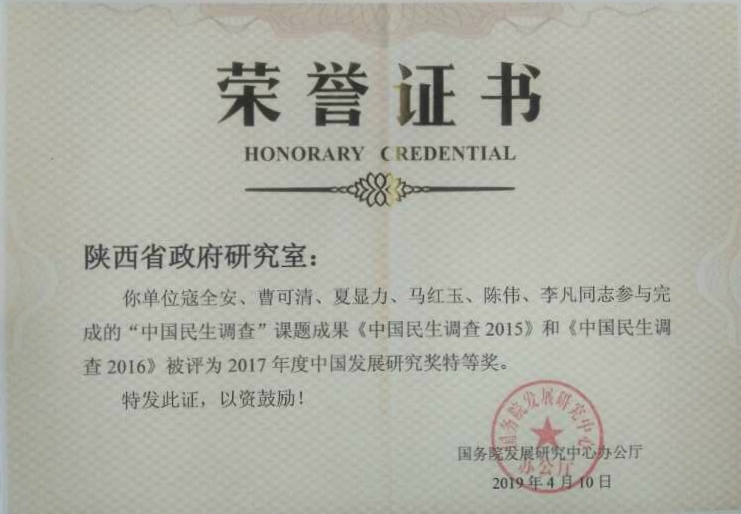 近日,从国务院发展研究中心办公厅获悉,澳门pg官网夏显力教授、马红玉副教授和陈伟副教授与陕西省政府研究室联合参与完成的“中国民生调查”课题成果《中国民生调查2015》和《中国民生调查2016》获得2017年度中国发展研究奖特等奖。