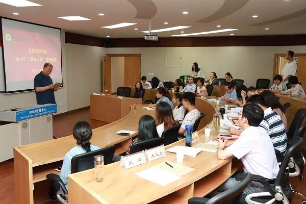 为挖掘“思政课+课程思政”的育人格局,大力推进习近平新时代中国特色社会主义思想和党的十九大精神进教材、进课堂。6月20日下午,学院于南校C301马蹄教室举办2019年“课程思政”教学观摩和教学竞赛。本次教学比赛由各系选拔出七名教师参加,学院教授委员会、督导组副组长王礼力教授、院长助理牛荣副教授、党委副书记张军驰、农经系主任赵凯教授、经济系主任王秀娟副教授、管理系主任刘超副教授、教工资源环境中心支部书记骆耀峰副教授7人担任比赛评委。王礼力教授出任主席。各系教师代表、新三年新进教师和学生等50余人到场观摩学习。