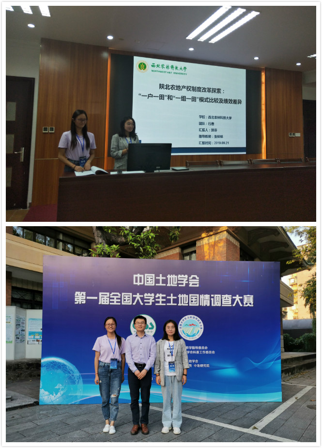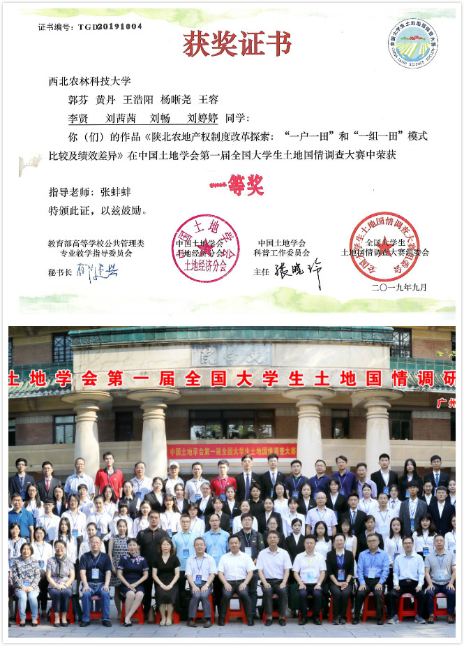 澳门pg官网土地资源管理专业2017级本科生郭芬、黄丹等领衔的行者团队在澳门pg官网青年教师张蚌蚌博士指导下,以“陕北农地产权制度改革探索:“一户一田”和“一组一田”模式比较及绩效差异”参赛作品入围决赛并荣获一等奖(奖金5000元)。该奖项的获得,有效锻炼了本科生的探索和研究能力,显著促进本科生加强专业课程学习并学以致用。队长郭芬感言,从确定题目、到问卷设计、到报告撰写,一次次的修改和制作PPT,多次的演练,成绩的取的离不开指导教师和陈海滨老师的悉心指导,感谢学院提供的平台。指导老师张蚌蚌说,“能够与东道主华南理工大学代表队,南京大学和浙江大学代表队共同获得一等奖,提升了澳门pg官网在同行中的声誉;体现了本科生的卓越创新能力,培养了学生的爱国和恋土情怀,激发了学生探索认知祖国土地的激情”。