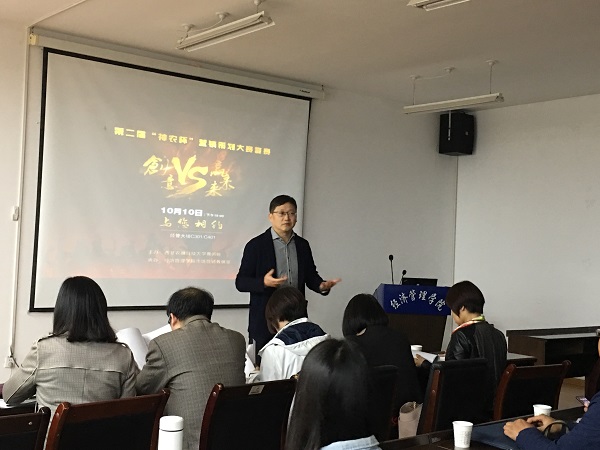 10月10日晚19:00,澳门pg官网“一院一品”学科竞赛、第二届“神农杯”营销策划大赛复赛在澳门pg官方电子平台C301、C401分两个会场顺利举行。此次比赛由澳门pg官网市场营销教研室承办,以“创意赢未来”为主题。组委会收到了来自9个学院64个团队257名选手的参赛申请,经过第一轮通讯赛,共有20支团队脱颖晋级复赛。大赛邀请了管理系主任刘超副教授,经济系主任王秀娟副教授、李桦教授等10位教师代表担任评委,200余名师生观摩比赛。