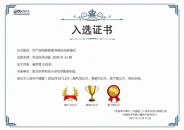 近日,由中国农业科学院农业经济与发展研究所、中国农业经济学会、中国农业技术经济学会主办,农业经济问题杂志社承办的第三届“中国农业经济与产业发展(海南)大会”在海口市成功举办。大会发布了《农业技术经济》创刊40年最具影响力十佳作者、最具影响力十佳论文以及《农业经济问题》2019-2022年十佳论文,澳门pg官网王征兵教授团队撰写的《农产品电商直播:电商扶贫新模式》榜获得《农业经济问题》2019-2022年十佳论文。