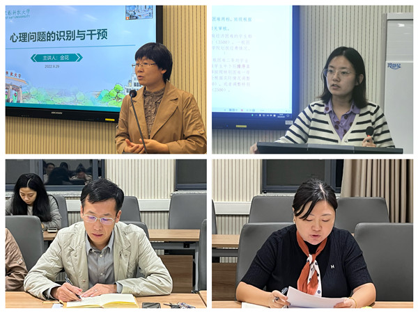 会上,金花以学生心理问题识别为主题,分别从危机识别,危机干预和如何进行积极沟通三个方面展开培训,期间列举了危机识别的多个行为线索和信号,对危机干预的方式和积极沟通的原则等心理教育方面的知识进行了细致的讲解和分析。随后,学院资助专员常小文带领新生班主任学习了班主任工作职责、本科生素质能力测评办法、家庭经济困难学生认定、奖助学金评定等文件内容,并对即将开展的评奖评优中的重点和难点做了针对性指导;学院团委书记、学工秘书张静传达学校国庆期间有关疫情防控工作的最新通知,并就十月份主要工作进行预告。