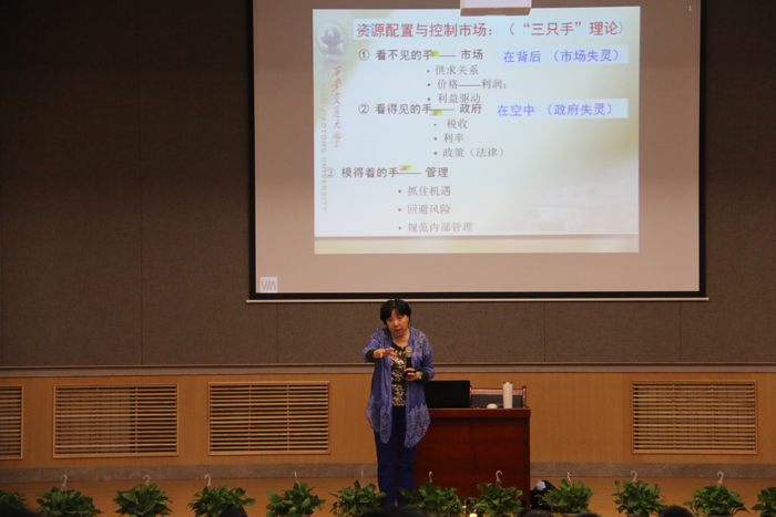 赵教授语言诙谐、风趣,见解独到。她认为社会主义市场经济除了市场和政府宏观调控这两只手外,还有第三只手:管理。企业决策者的有效领导、领导力的差异直接决定企业未来的发展走向。在市场形势和政府宏观调控政策相互作用影响下,情况错综复杂,发展时机稍纵即逝,只有领导者不断修炼,掌握领导艺术、提升领导力,做正确的事,正确的做事,才能带领企业健康、可持续发展。