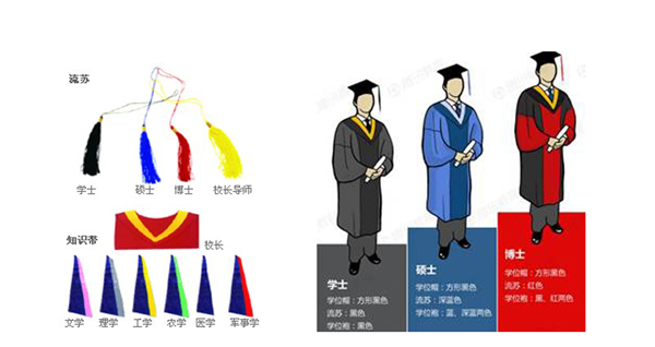 博士学位流苏为红色,硕士学位流苏为深蓝色,(院、所)长帽流苏为黄色。