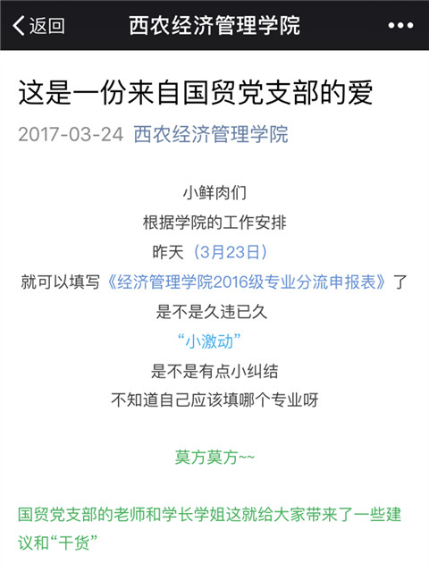 国贸支部全体党员积极行动,首先总结了2010-2017届国贸专业同学毕业流向,重点汇总了保研、考研、出国、考公务、仅金融机构及进我国百强企业的同学名单目录。其次,通过多种途径将信息传播出去。如在学院学工办的热情支持下利用“西农澳门pg官方电子平台”微信公众平台推送“这是一份来自国贸党支部的爱”,阅读量达1000;利用微信圈子转发、制作《这是一份来自国贸党支部的爱》宣传手册等等。第三,联系已毕业及在校国贸优秀学子做主题报告或面对面交流。如优秀在读博士生侯建昀、硕士生黄腾、2013级就业达人裴玉璘、保研达人张馨月、张鹏飞以及2014级全面发展的张安琪、张怡萍、吴鑫桐等。大家以自己的亲身经历现身说法,为各位学弟学妹们展现了一个又一个鲜活的例子,也让学弟学妹们对于国贸专业有了一个全新的认识,侯建昀学长情真意切的演讲更是让大家对未来在国贸专业的学习与成长有了新的希望。我们不仅向学弟学妹们介绍了国贸专业的基本概况、发展方向、课程内容以及师资力量,而且提问环节对学弟学妹们提出的问题、疑惑进行了耐心的解答。