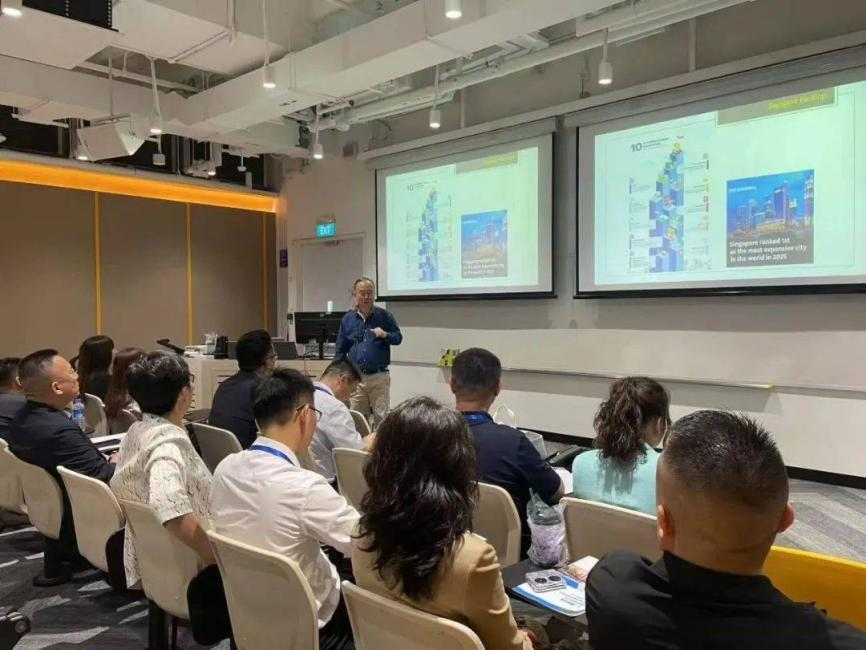 师生们前往新加坡星展银行(DBS)进行座谈交流。星展银行是蜚声全球的新加坡第一大银行,曾被银行业三大国际权威刊物《欧洲货币》、《银行家》、《环球金融》,评为“年度全球最佳银行”,这是亚洲唯一。2018年以来,星展银行更是连续5年被《环球金融》评为“全球最佳银行”,2009-2024年连续16年被评为“亚洲最安全银行”。星展银行的企业部和贵宾部共同接待了研学团,在主题交流环节,银行代表介绍了星展银行的发展历程、业务范围以及在金融科技方面的创新实践,介绍了全球银行如何支持企业数字化转型、绿色金融、跨境并购等最新趋势,让学员们站在金融机构视角思考如何融资、控风险、拓海外。学员们积极提问并与银行代表进行广泛交流,深入了解新加坡金融业的跨境资金流动优化方案与区域税务合规体系,探讨区块链技术如何重构供应链金融生态,深化对国际资本运作风险管控的理解。