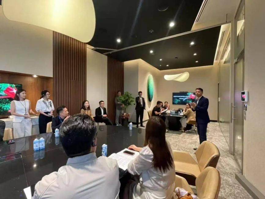 师生们在集团展厅认真听取了其从农化科技到可再生能源的多元化产业矩阵,重点了解智能化肥料生产系统、医用级手套研发实验室、太阳能项目、数字化供应等领域的发展情况,本次交流搭建了中马产业对话的高效平台。研学团成员表示,通过直面行业领袖与技术创新源头,对东盟市场发展逻辑与跨国企业战略布局形成具象认知,为未来参与国际产业合作储备实践经验。在随后的座谈交流环节,中马双方企业家学员分享了各自企业的发展历程、优势以及在“一带一路”倡议下的发展机遇与挑战,共同探讨了合作项目的可能性,如贸易往来、投资合作等。