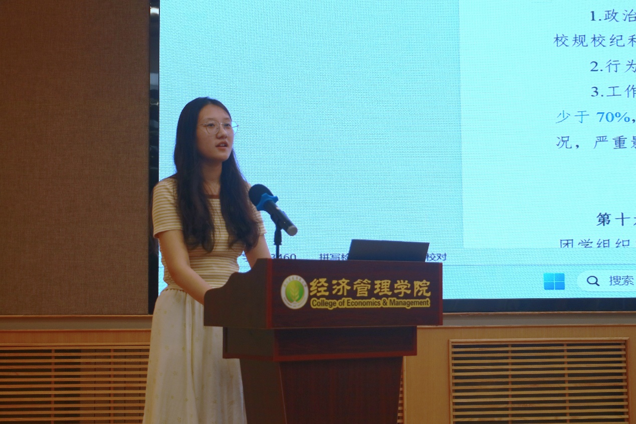 随后,学生会执行主席王宇璇同学详细解读团学工作人员考核办法。她从考核原则、考核内容、奖惩机制等方面逐一说明,明确了工作要求与发展路径,为团学工作人员的履职尽责、成长进步提供清晰的制度指引与保障。