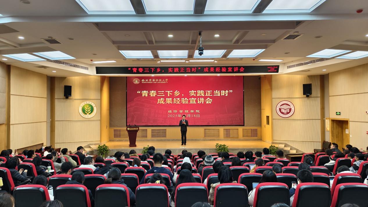 为深入总结暑期三下乡社会实践成果,强化实践育人实效,激发广大学生投身社会实践与劳动锻炼的热情,12月18日晚,经管学院在南校C101报告厅隆重举办了2025年“青春三下乡,实践正当时”成果经验宣讲会。本次分享会特邀学院四支优秀实践队伍的代表登台宣讲,聚焦非遗传承、生态治理、文化振兴与红色教育等主题,分享他们在实践中的所见所闻、所思所悟。各年级学生百余人参加了此次活动,现场学习、交流气氛热烈。
