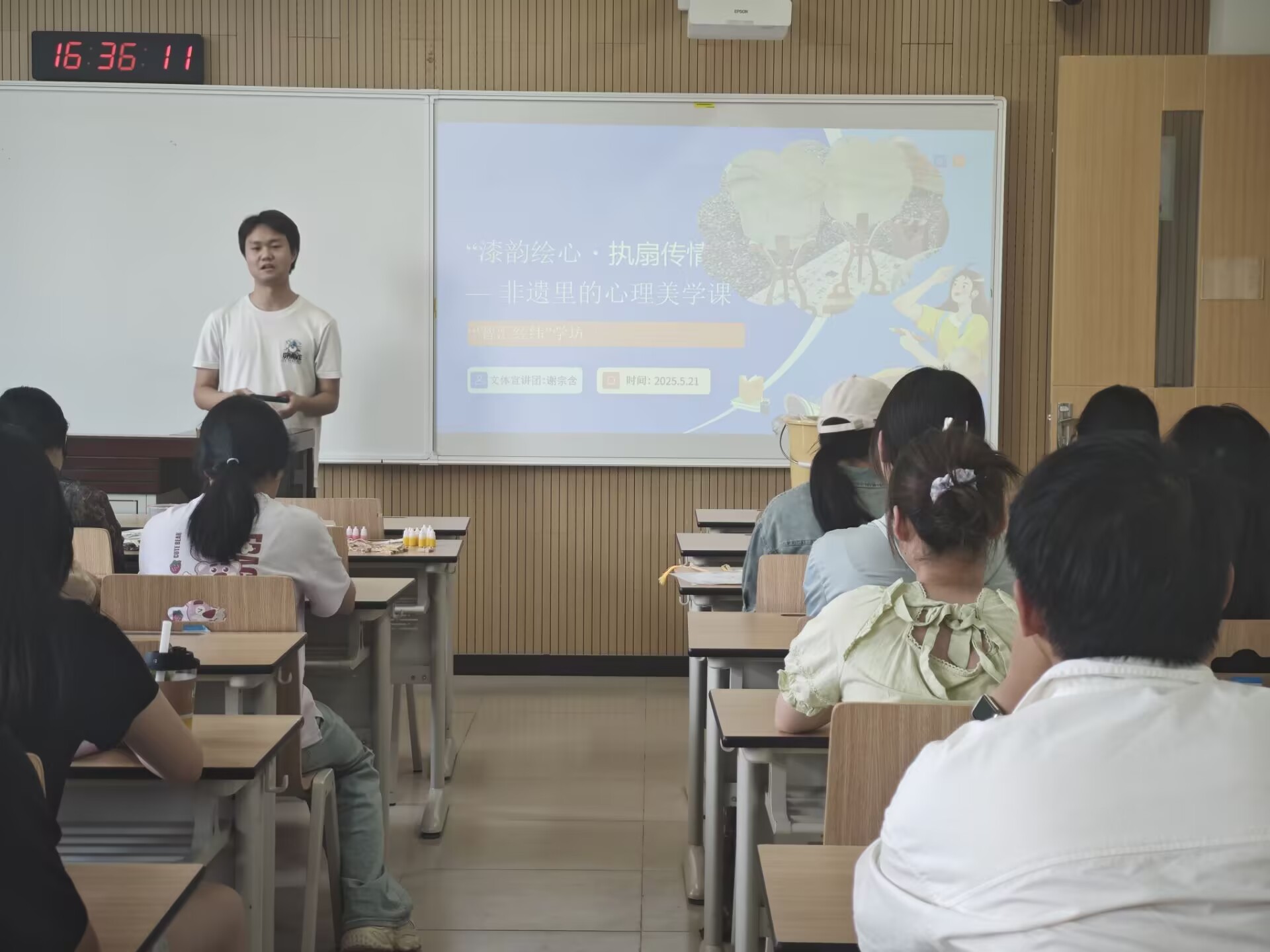 漆香阵阵,扇韵悠悠。5月21日下午,澳门pg官方电子平台心理权益部联合“智汇经纬”文体活动体验坊,在南校一号教学楼成功开展“漆韵绘心·执扇传情”非遗心理美学体验活动,60余名同学在非遗漆扇的魅力中,感受千年技艺的文化底蕴,体验漆墨流彩的心灵疗愈。