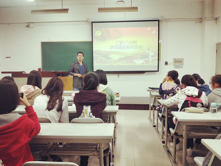 在二零一七年国庆到来之际,为培养学生爱国精神,激发同学学习积极性,进一步提升班级凝聚力,经管学院工管1710班于9月28日傍晚在8号教学楼召开了学风建设系列活动。此次活动由班主任侯现慧老师亲自主持,全体班级成员参与。