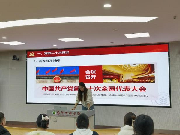 会议伊始,组织观看了中国共产党国际形象网宣片《CPC》的视频学习资料。视频文案简洁、真诚、有力量,镜头精美,节奏恰当,勾画出一个有理想、有信念、有责任、有担当的大国大党形象。随后,渠宇飞同志以题为《学报告、悟思想、开新局——深入学习党的二十大精神》为大家做专题宣讲,从党的二十大概况、党的二十大报告的时代价值、党的二十大报告的主要内容和重大创新等方面,对党的二十大提出的新思想新论断、作出的新部署新要求,作了全面、系统、深入的阐释解读。最后,渠宇飞同志认为,作为强国一代的新时代青年,我们要在学习贯彻二十大精神上带头做好表率,秉承老一代西农人的热情与智慧,积极服务强农兴农,为助力乡村振兴战略、生态文明建设和“三农”工作,全力推进建设世界一流农业大学提供源源不断的“西农智慧”“西农力量”和“西农方案”,在实践中成就出彩人生。