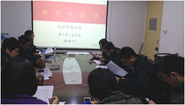 1月6日下午,教工第三党支部全体党员召开了新一年的第一次组织生活会。此次组织生活会包括三个内容:第一是“三严三实”学习;第二是解读中央经济工作会议精神;第三是讨论2016年支部工作。