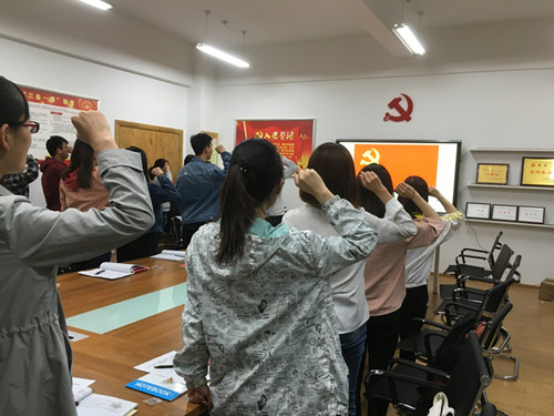 为了响应学院“亮身份、践承诺、树形象”主题实践活动安排,丁坤向支部成员介绍了“亮身份、践承诺、树形象”主题实践活动文件精神,并给支部党员和预备党员佩戴党徽,要求大家佩戴党徽,亮明身份,接受同学监督,积极发挥党员的先锋模范作用,切实做到热爱公益,乐于助人,积极组织并参加公益实践活动,践行党的宗旨。随后,丁坤带领支部全体成员面向党旗进行了庄严宣誓,重温入党誓词,明确责任担当,支部成员均签署了“亮身份、践承诺、树形象”主题实践活动承诺书,表达为人民服务的决心。