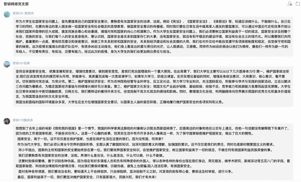 会上,院党委副书记张军驰同支部每一位同志分别连线,询问大家近期的学习情况、生活情况及是否有什么困难,对线上学习和心态调整给予了相应的建议,支部同志们感受到了亲切的关怀。随后,全体同志共同学习《牢固树立总体国家安全观在新时代国家安全工作中的指导地位》,并观看公益短视频《防控疫情 法治同行》。最后,大家对本次学习内容积极进行交流和讨论,张文轩同志表示:“通过此次学习,记住了一个电话号码,12339,一支特殊的力量,两个战场,三个法律,三种要举报的行为,只有维护了国家安全,才能实现国家的长治久安。作为当代大学生,要有维护国家安全的意识,履行保护国家安全的义务。维护国家安全,人人有责。”