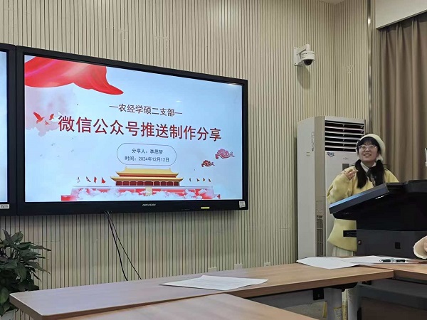 预备党员转正大会后,支部副书记李思梦以最新制作的推送《“光影铭记英雄志,党心共筑强国梦”——农经学硕党团支部开展联合观影活动》为例,展开了应该如何在微信公众号进行推送制作的分享。李思梦从公众号的主题选取、内容策划、排版设计、推广运营等方面进行了详细的讲解和展示,支部成员认真聆听,积极提问,共同探讨如何更好地利用公众号平台展现支部风采、传播正能量。